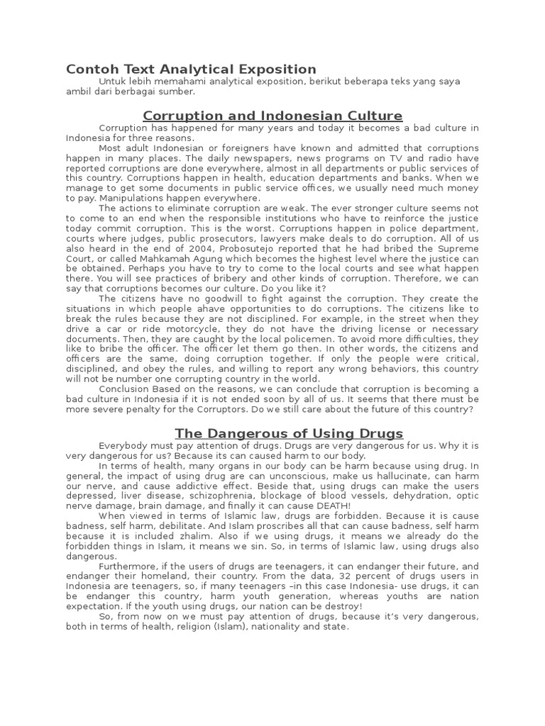 To better understand analytical exposition text, let's look at an example in the following sentence which consists of the three structures above exposition text example. Analytical expositiontext :pengertian,tujuan, ciri dan generic strukture dalam bahasa inggris beserta contohnya.
