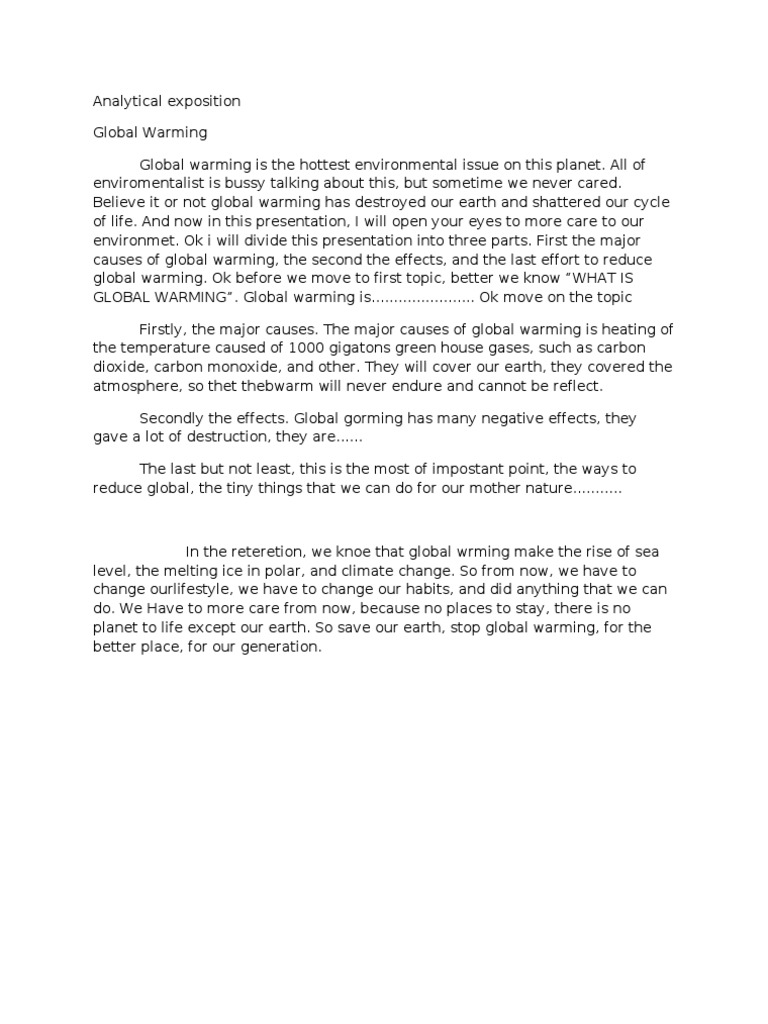 Contoh Analytical Exposition Text Global Warming - Koran Langganan from image.slidesharecdn.com Should children wear hats at school? Learning this kind of text will cover the purpose of analytical exposition, the generic structure of exposition text. The series of argument will strengthen the thesis stated before. Furthermore, people who do not smoke but they are in smoky area have the bad effect too from the smoking habit. Beside narrative text, an exposition text is another text genre which should be studied in high schools. Off course, analytical exposition text has a purpose, it is to persuade the readers by presenting one side of an argument. Example of analytical exposition integrated pest management there is no one best way to deal with pest agriculture. In this example of analytical exposition text, paragraph 2 and 3 are the detail arguments presented in a reporting fact.